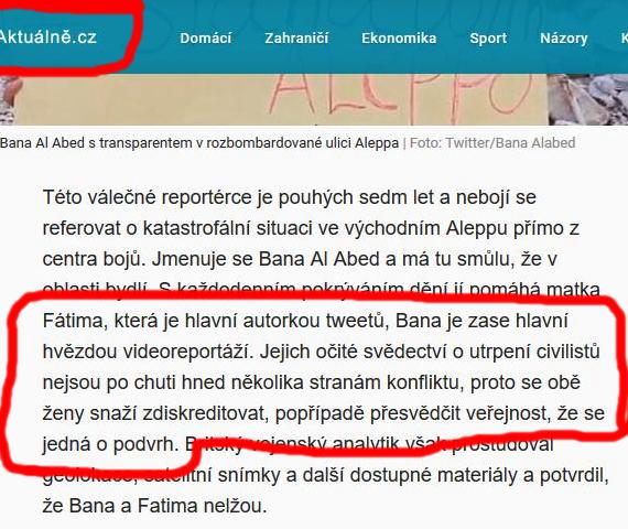 Hlavní propagandistická média začala zveřejňovat úpěnlivé volání z Aleppa, kdy 7letá Bana běhá mezi kobercovými nálety a prosí o pomoc madam Obamovou, ať už zastaví Putina a Asada. Protože však některé texty mizí, některé se zkrátily jenom do podoby, že Bana prosila o mír a dokonce tweety Bany též, některé jsme ofotily a nyní předkládáme. Zde alespoň Český rozhlas a Aktuálně.cz