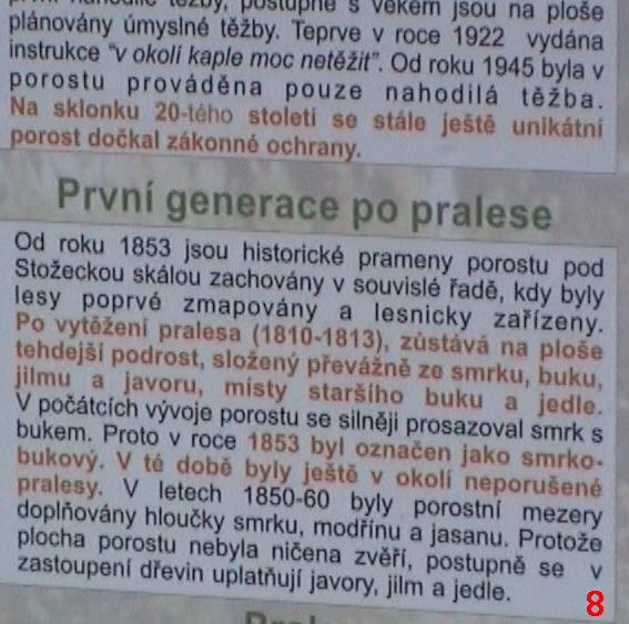 | Ale efekt, který se provádí u mokrých domů - že se "podřízne" a tím se přeruší vzlínání, bychom neměli uplatňovat vykácením pruhů lesa, jako to tehdy udělal J.A Schwarzenberg. Sice zajistil lidem na čas práci, ale vzhledem k těmto zásekům přerušil přirozené vlhčení vyšších pater lesa. Tady ve Stožci se to za dvě stě let napravilo, ale jinde jsou nedozírné škody, protože z pohledu z letadla vidíme tyto nesmyslné záseky všude. A výsledek je katastrofální. (A nemusí to být jenom klasický lesní zásek, stejné smutné efekty vidíme i tam, kde protíná les širší silnice a tam také slunce vytvoří úhor, kudy se vlhkost už výše nedostane). |