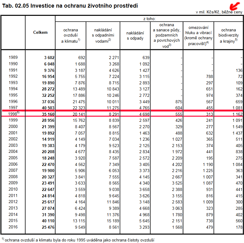 Nikdo, nikdo na světě tolik nevložil do životního prostředí a navíc to přepočítávejte na ceny tehdejší! Platy byly kolem 4000 Kč měsíčně. Dnes 34000Kč měsíčně. Pak 2.ledna 1998 nastoupil dočasný Tošovský, následně Zeman a s ekologií to šlo ke dnu. Vždyť nejvíce peněz na ekologii se vydávalo právě za vlád Václava Klause. Stačí se podívat do statistik, jaké procento hrubého domácího produktu šlo na ekologii tehdy a jaké dnes. Mimochodem, za Klausovy vlády byl například realizován grandiózní projekt odsíření tepelných elektráren, který zbavil severní Čechy každoročních smogových pohrom. Rychlost, s jakou byl celý projekt realizován, je považována za světový rekord. Také je možné připomenout investice do výstavby desítek čističek, díky nimž přestalo být Labe stokou.
