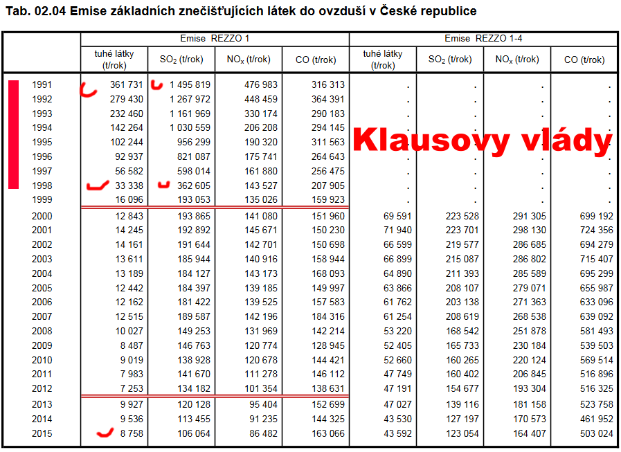 A nyní ve faktech a číslech. Klausovy vlády zasahují až do roku 1998, na kdy připravil státní rozpočet. Za sedm let se snížily tuhé látky v ovzduší z 361 731 t/rok na 33338 t/rok. Neuvěřitelný pokles. I další čísla potvrdila obrovský pokles.