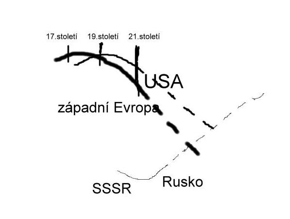 Západní Evropa byla na výši velmi dlouhou dobu (v období před USA). Za toto období se stále více přibližovala modelu, který nastolil Sovětský svaz po říjnové revoluci. Ten přeskočil etapu kapitalismu, samozřejmě jako velmoc ztroskotal, a proto svět začal "kulhat". Teprve teď nastává období, kdy začne opravdová konkurence velmocí. Západní Evropa odpadla první, kdy různé systémy přerozdělování zničily přirozený chod konkurence a začaly stagnovat. Stále více se do popředí začal dostávat ryzí, kapitalistický systém, co nejvíce liberální, který představovala v 19. a 20. století Amerika, v převážné míře USA. Dokázala nejen převzít peloton ekonomický, ale i absorbovat velkou část zboží, které se ve světě vyrábělo. Jenomže období kolem roku 2000 začíná být zlomové. To, co představoval východní blok, tzn. deficity (i když skryté) se hlavně v bývalém SSSR snižují, splácejí se dluhy a přecházejí do ofenzivy. Západní blok se stále více omotává pavoučí sítí přerozdělovačů a dostává se do jejich pasti. Přerozdělování požírá obrovské množství lidského potencionálu.