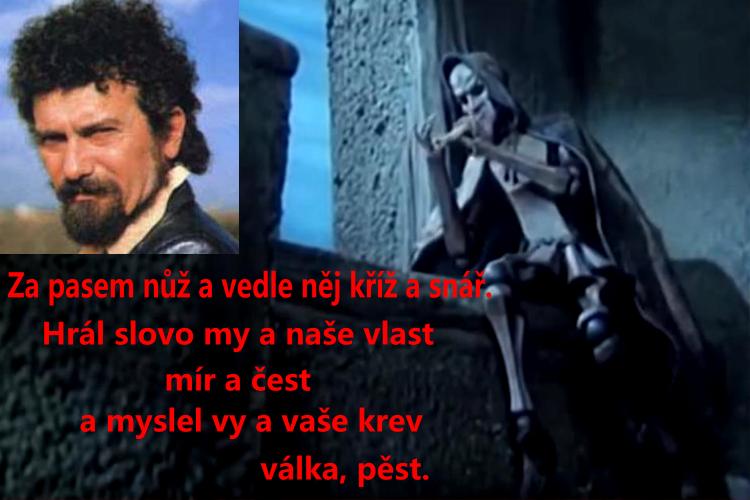 Hrál slovo "my" a "naše vlast", "mír" a "čest" a myslel "vy" a "vaše krev", "válka", "pěst", co musel znát, co uměl hrát svůdnejch not. Co divnejch slok, co divnejch slok dlouze hrál a z každý z nich hořící vích horce řval: nastoupit v řad, na rámě, zbraň, pochodem v chod!