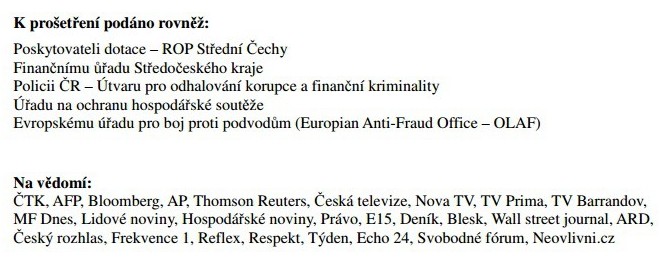 Navíc překvapuje, že se kromě Policie ČR nikdo z dalších adresátů anonymního podnětu – ROP Střední Čechy, Finanční úřad Středočeského kraje ani ÚOHS – podnětem zřejmě nezabývá, nebo se k němu aspoň nevyjádřil a že jejich stanoviska nezajímala ani naše investigativní média. Žádné si totiž nedalo práci s obsahem anonymního podnětu a nepokusilo se jej dát do kontextu policejního vyšetřování", napsal Jiří Chýla