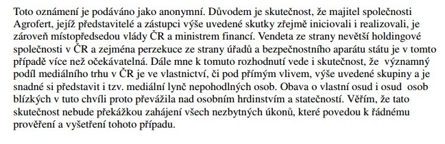 Že si děti Babiše zkusily vybudovat farmu zakázané není. Zda jim pomohl i otec Babiš z Agrofertu asi nikde napsáno nebude. Jinak by anonymní trestní oznámení nebylo psáno formou spekulace, ale přímo by se odvolalo na konkrétní čin a Babiš už by měl smůlu. Co mají v záloze státní zástupci, či zda je to pouze komplot americké ambasády a probruselské kavármy nikdo neví. Pouze se v tisku objevují úvahy, že je to konstrukt jakoby z pera Ištvana o desítkách miliónů a kilech zlata, což se nakonec ukázalo jako blamáž a soud soudí Nagyovou (Nečasovou) za kabelky a jakýsi další konstrukt sledování sokyně v lásce.