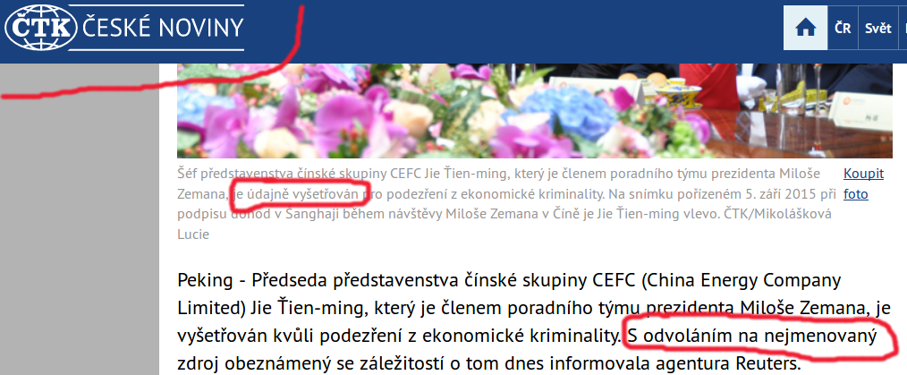 Šéf představenstva čínské skupiny CEFC Jie Ťien-ming, který je členem poradního týmu prezidenta Miloše Zemana, je údajně vyšetřován pro podezření z ekonomické kriminality. Toliko zpráva ve zpravodajství České televize.