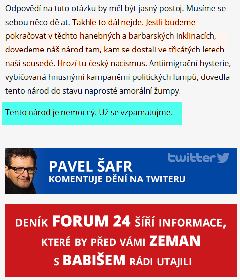 A není to jenom Šafr, ale i Gabal a další, kteří děsivě urážejí českou majoritu, zatímco bývalý člen SPD za podobné výpady pouze v obráceném gardu dostal podmínu (Obvodní soud pro Prahu 1 uložil bývalému tajemníkovi hnutí Svoboda a přímá demokracie Jaroslavu Staníkovi za nenávistné výroky pronesené ve sněmovně trestním příkazem roční vězení, které podmíněně odložil na zkušební dobu dva roky, a peněžitý trest 70 000 korun. Uvedla to ve středu Česká televize (ČT))