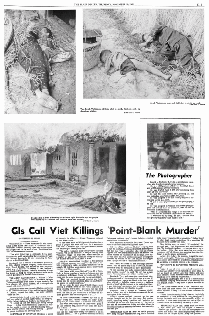 Masakr ve Vietnamu: Společnost amerických vojáků brutálně zabila většinu lidí - žen, dětí a starých mužů - ve vesnici My Lai 16. března 1968. Více než 500 lidí bylo zabito v masakru My Lai, včetně mladých dívek a žen, které byly nejdříve znásilnění, pak zmrzačeny, následně brutálně ubity či zastřeleny. Od 12. do 20.listopadu 1969 uveřejňoval americký investigativní novinář Saymour Hersh informace o incidentu v časopisech Time, Life a Newsweek.
