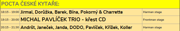 Jedinečný koncert české kytarové superkapely, která v historii nemá obdoby. Ve speciálním koncertním setu se na jednom pódiu vystřídali mistři české kytary: Michal Pavlíček, bluesman/jazzman Roman Pokorný, progresivní star Rony Janeček, ve světě uznávaný a oceňovaný jazzman David Dorůžka, bluesman Luboš Andršt, frontman minus123minut Zdeněk Bína, frontman Olympic Petr Janda, rocker Miloš Dodo Doležal a legendární klasik Jiří Jirmal v doprovodu Stanislava Barka. Tuto superkapelu doplní výborný frontman, multiinstrumentalista a dlouholetý zpěvák Blue Effect Honza Křížek, ostřílená rytmika kapely Vltava Tomáš Uhlík a Ondřej Pomajsl, a také člen kapely Lucie, muzikant srdcem i duší David Koller.