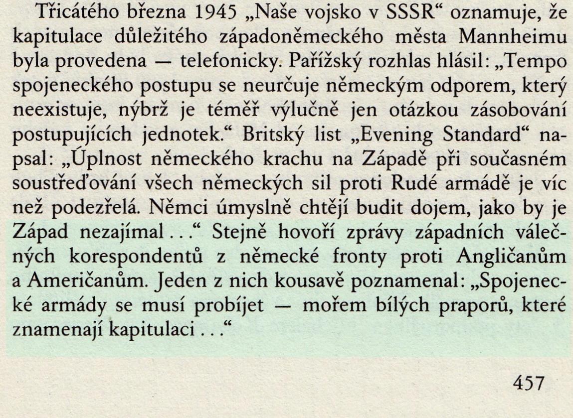 Taková je skutečnost. V dubnu 1945 si Sovětská vojska musela klestit cestu územím šesti států a měla proti sobě drtivou většinu německé branné moci, a přesto se probila do Berlína dřív, než tam prakticky bez odporu došly armády jejich západních spojenců.