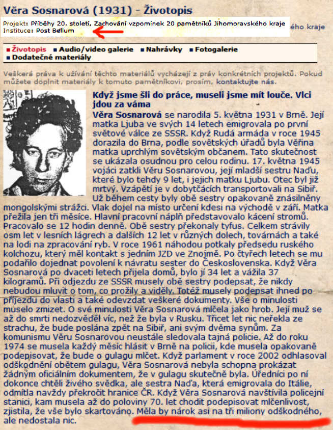 | Redaktor TV Nova Josef Klíma to 3. srpna 2004 v pořadu Sibiřská penze řekl jasně: [...] česká kapitalistická byrokracie se liší od té sovětské komunistické jen pramálo. Dvacet let nešťastné ženě trvalo, než se dostala z gulagu, a téměř dvacet let bojuje za to, aby ji za její utrpení konečně někdo odškodnil.Takto postavený příběh byl od té doby reprodukován na stránkách snad všech novin, v rozhlasových a tele-vizních pořadech a besedách. K jeho popularitě přispělo i syrové a emotivní podání z úst Věry Sosnarové. Mediálně nejvděčnější a nejci-tovanější pasáže shrnuje redaktor televize Nova David Vondráček v již zmiňované reportáži Odškodění za práce v sibiřském gulagu ze 4. února 2003: Jednasedmdesátiletá Věra Sosnarová z jihomoravské vísky Odrovice už ani neví, kolikrát byla za svůj život znásilněna. Stokrát, tisíckrát? Zažila okamžiky, kdy lidé umírající hlady pojídali své blízké, vraždění tisíců zaživa v hořících srubech. Nežije snad dnes na modré planetě člověk, jenž by zažil to, co ona. Dodnes patří tyto a další hrozivé vzpomínky (pohřbívání vězňů zaživa, jejich zabíjení za nesplnění normy, trávení jedem atd.) mezi nejčastěji reprodukované na veřejných besedách i v médiích. Jak dokládá výše zmíněná reportáž, lidé rozhořčení postojem úřadů a šokovaní osudem Věry Sosnarové jí začali již v roce 2003 posílat finanční dary. Nezůstalo však u jednotlivců. Například 13. května 2008 přinesla Mladá fronta Dnes článek s názvem: Ženě odvlečené do gulagu místo státu pomůže nadace.Autor Jan Gazdík v něm mimo jiné píše: Českým byrokratům dal včera morální lekci Nadační fond angažovaných nestraníků. Když Sosnarové nepomohl stát, vyplatí jí alespoň částečné odškodnění místo něj. [...] „O věrohodnosti paní Sosnarové nepochybujeme, |