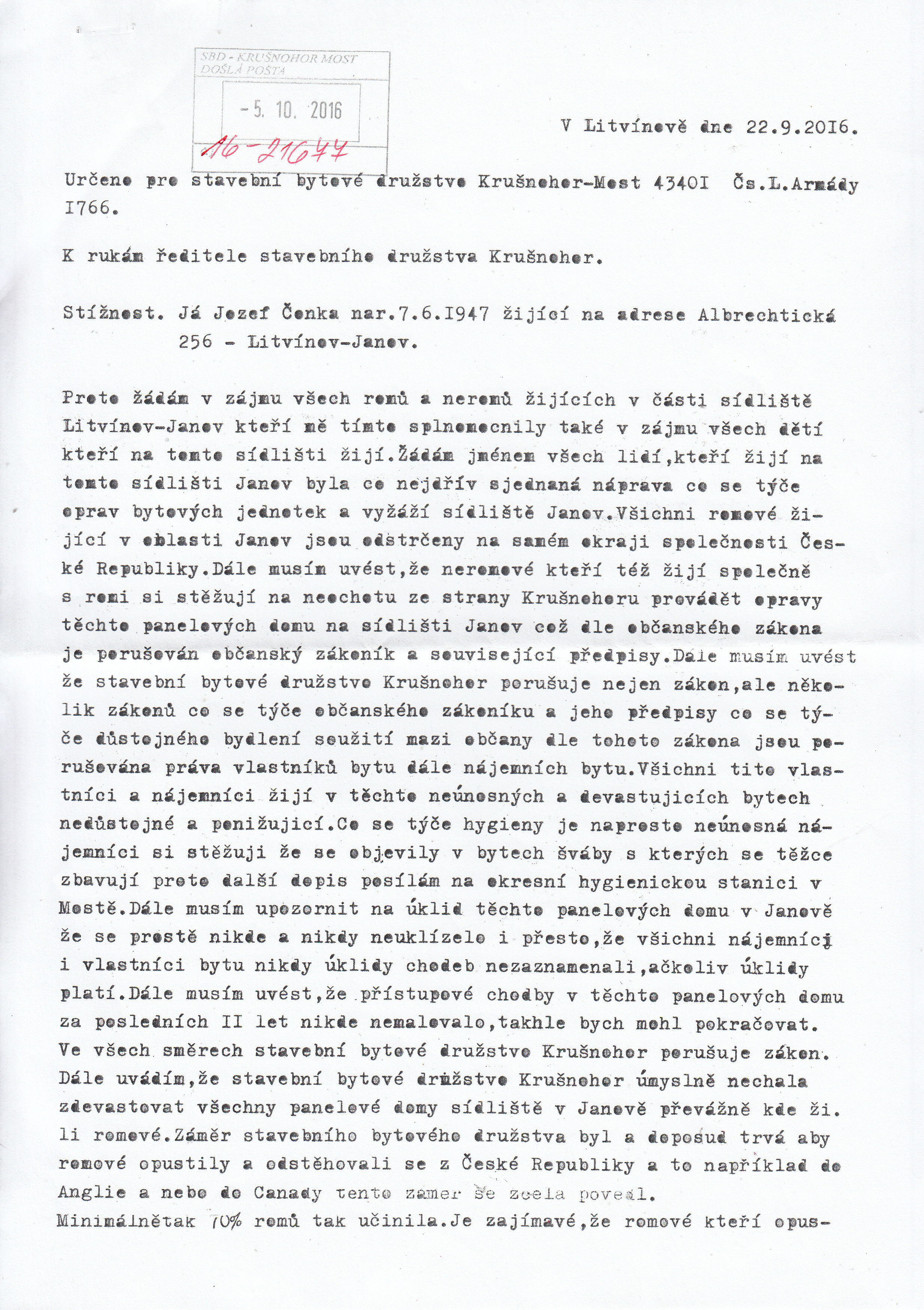 Petici za nápravu: okamžité bytové řešení v dopise, ve kterém formou petice Čonka prokazuje, že Romové se o svěřený majetek náležitě starali a majitelé bytů Krušnohor jim byty zdevastovali, vybydleli a rozkradli, byl doručen vedení Krušnohor. Pokud nám nebude odpovězeno do 30 dnů, napsal Čonka, bude podána na SBD Krušnohor hromadná žaloba k Okresnímu soudu. (Originál dole)