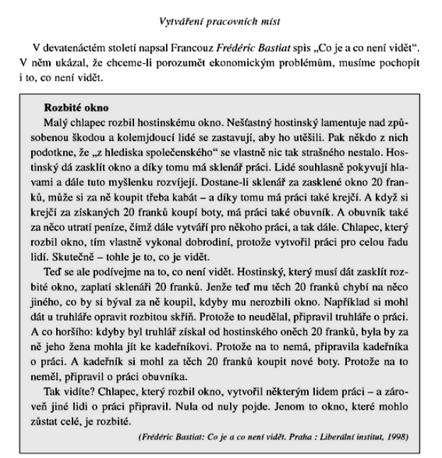 „Existuje jen jeden rozdíl mezi špatným ekonomem a dobrým ekonomem: špatný ekonom se omezí jen na viditelný účinek, kdežto dobrý ekonom bere do úvahy jak účinek který je vidět, tak i ty účinky, které nejsou vidět a které musejí být pouze předvídány. Ale tento rozdíl je obrovský, protože se skoro vždy stává, že je li okamžitý důsledek příznivý, pozdější, vzdálené účinky jsou katastrofální.“