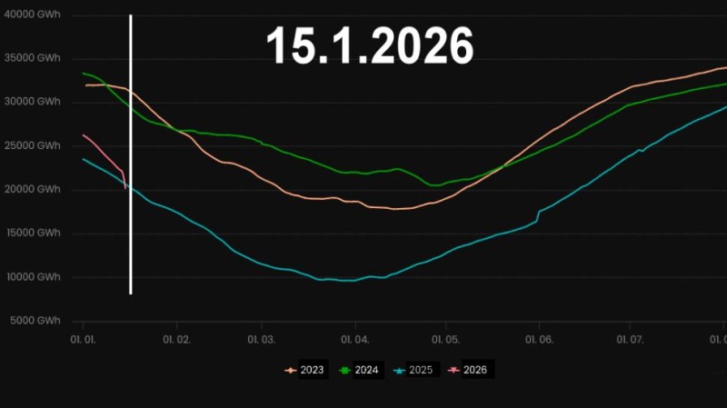 15. ledna 2026 jsme prorazili pětiletou frekvenci odčerpání plynu, kdy k tomuto datu jsme z nejnaplnějších zásobníků překonali hranici nejméně naplněných zásobníků. (Screen v úvodu)
