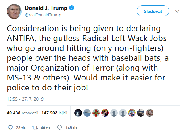Prezident Trump v sobotu na Twitteru uvedl, že je zvažováno označení Antify, jejíž členy popsal jako radikální levicové šílence, za teroristickou organizaci. „Usnadnilo by to policistům práci!“ dodal.