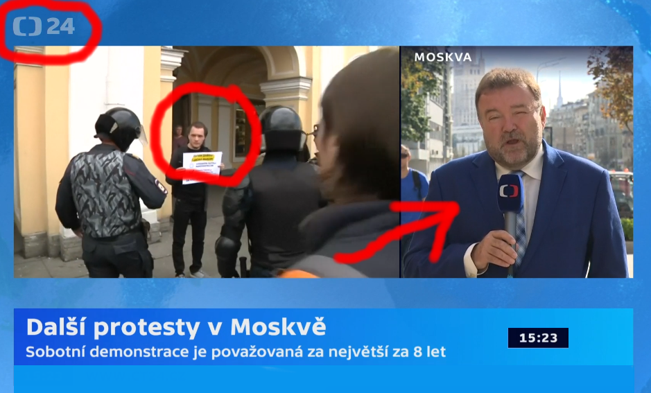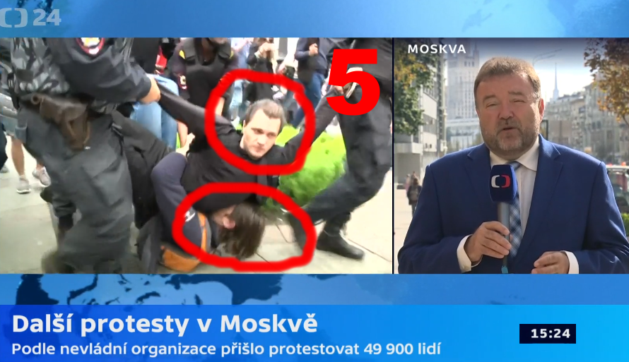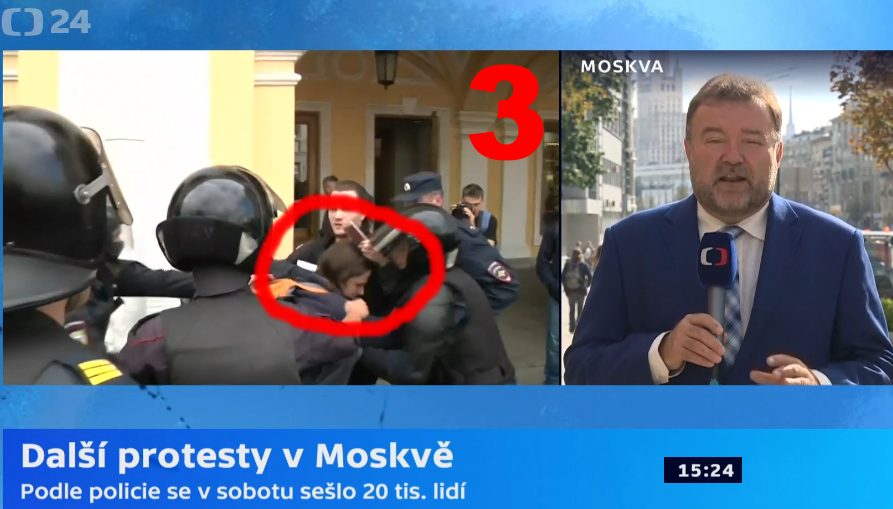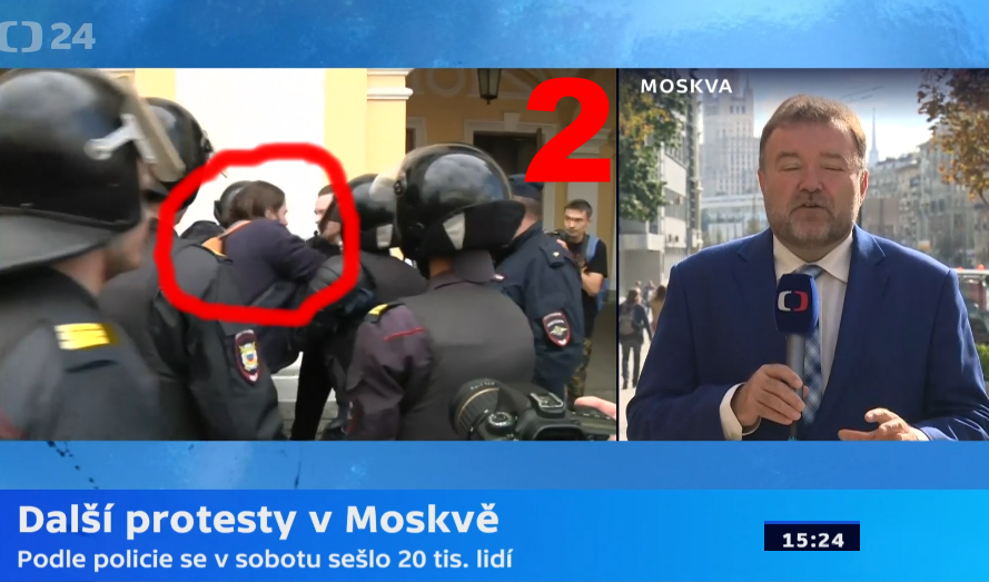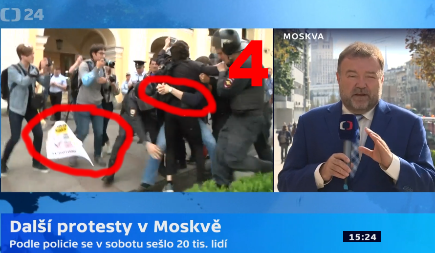 A západní novináři filmují, fotografují, protože tu strašnou brutalitu musí celý svět vidět. Bohužel pro Karase a Českou televizi jdou záběry zvětšit a dokázat, kdo co ve skutečnosti dělá a dokonce v záběru s Karasem, který vykládá o strašném údělu ruské opozice, kdy brutální zásahy Putinova režimu...