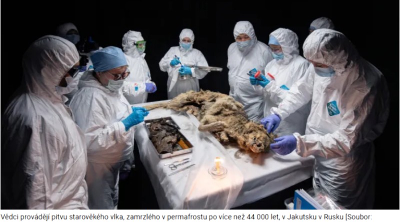 Ruští vědci provádějí pitvu vlka zamrzlého ve věčně zmrzlé půdě po dobu asi 44 000 let, nález byl podle nich první svého druhu.
