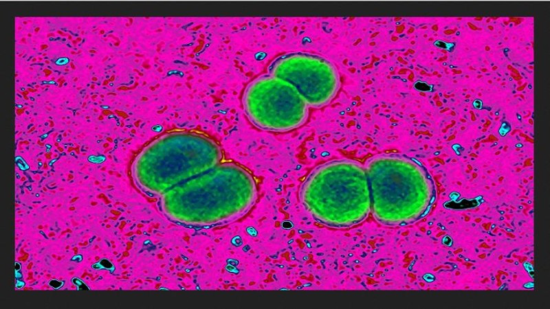 Na obrázku původce meningokokové infekce Neisseria meningitidis pod mikroskopem.
